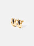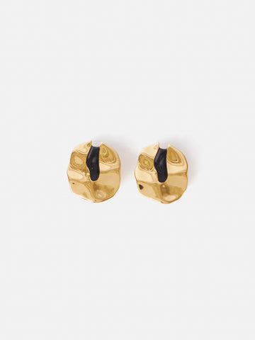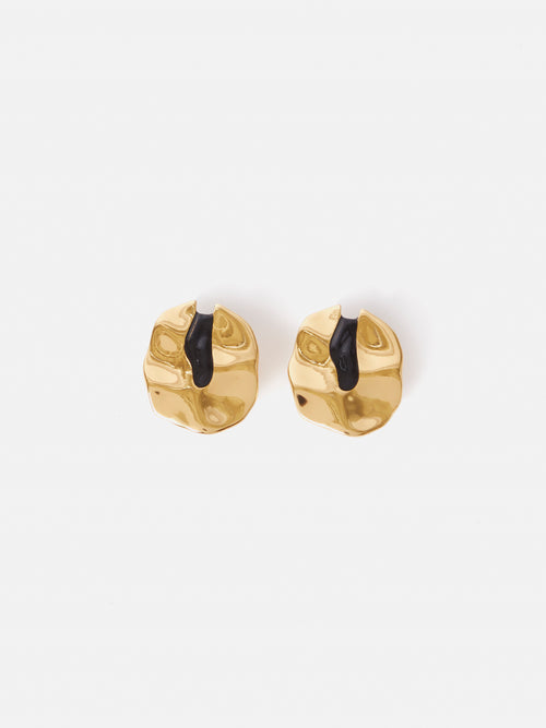In our classic hammered texture, these disc earrings feature a molten finish on the metal and the shiny black enamel for a unique update to you go to stud earrings. Plated in 24ct gold, these earrings are sure to catch the light and add interest to you autumn winter ensemble. Fit and Features
