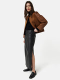 A popular comeback: This ethically sourced jacket, a returning best-seller, combines nappa leather and suede for a stylish mix. The short, straight, edge-to-edge fit offers a versatile silhouette, allowing for easy layering under heavier coats. Its clever design includes concealed front pockets, enhancing both functionality without compromising aesthetics. This jacket complements any of our other chocolate leather separates.