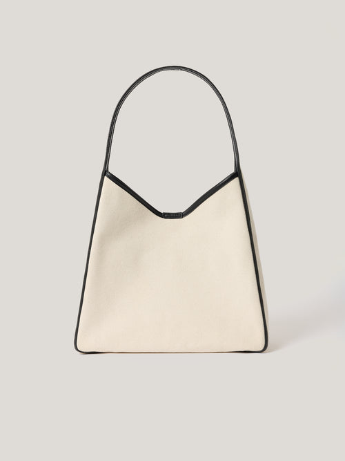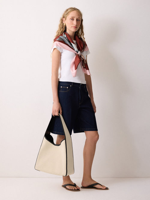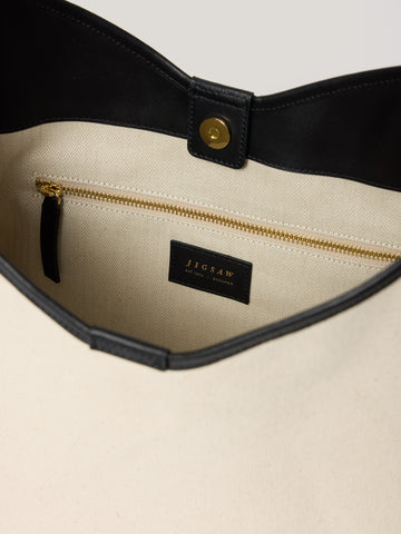 The Heckfield is a Jigsaw icon, reimagined for summer in a cotton canvas with a contrasting black leather trim. The slouch silhouette boasts ample interior space for all your essentials. We love the wide shoulder strap for ease carrying day-today with a magnet closure to keep things safely stowed.