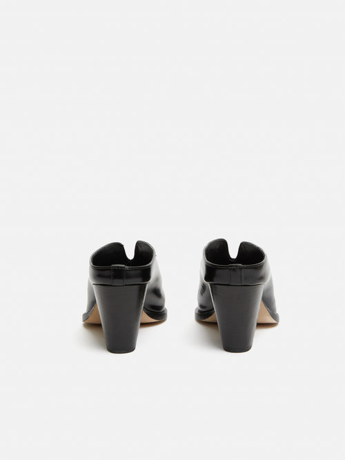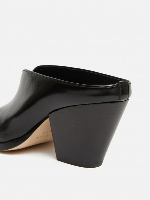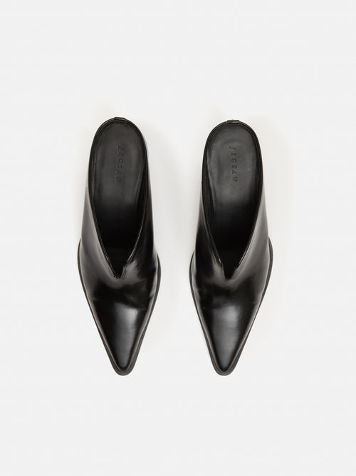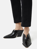 Our sculptural Oakley Mule features a pointed toe, western inspired block heel, smooth black leather and underfoot padding for the perfect wear all day shoe. Chic and versatile, pair with trousers and dresses alike for the perfect transitional look.