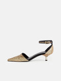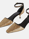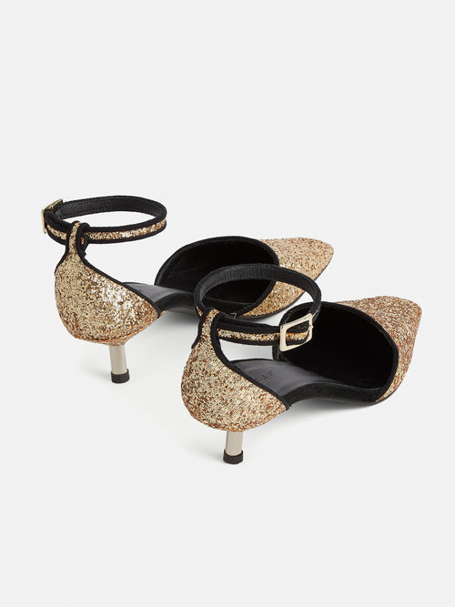 Our best selling party shoe is back and this time in multiple colours! Made in Spain this wearable low metal kitten heel style with feminine ankle strap and modern square toe is encrusted with glitter. Style with laid back tailoring, denim and dresses. Fit and Features