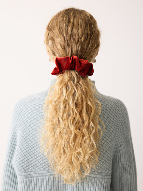 A scrunchie crafted in a heavyweight velvet is the subtle accessory to add some texture to your party looks.