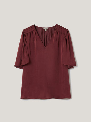 Sustainable in a luxe recycled satin, this blouse is framed with an intricate pleated trim around the collar and short sleeves that hang beautifully off the shoulder; perfect for wear day or night.
