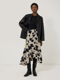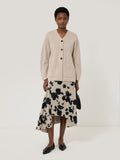 The graphic rose print seen on this midi skirt has been borrowed from the textile design archive of Bianchini Ferier. Reimagined onto a luxurious beige cotton with bold blue outlining creates a beautiful juxtaposition of colours. Asymmetric panels add beautiful drapery to the skirt which falls below the knee.