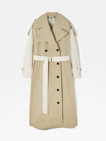 Introducing this season's reimagination of the iconic Nelson trench, boasting contrast panels that infuse a captivating, deconstructed allure. Continuing its timeless appeal, the trench retains signature details: water-resistant finish, adjustable buttoned epaulettes, a double-breasted front with contrasting horn buttons, and buttoned cuff straps. Elevate your silhouette by cinching your waist with the self-belt, injecting a touch of femininity into this traditionally masculine staple.
