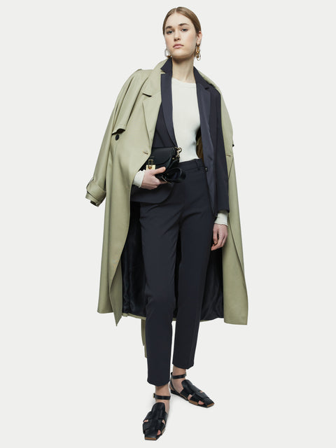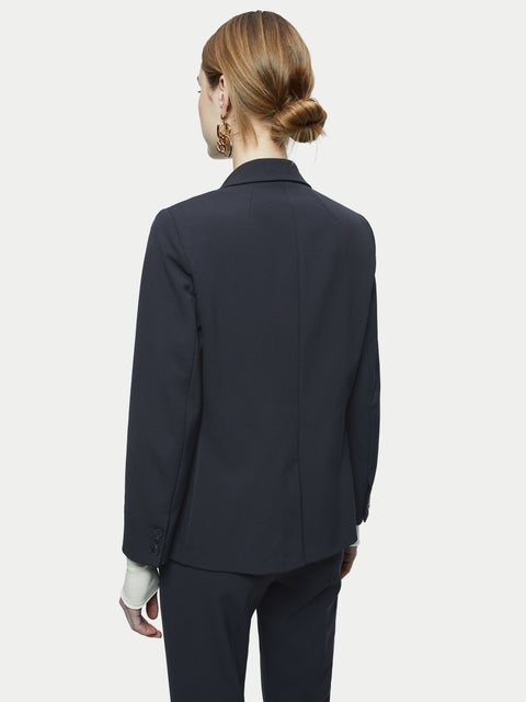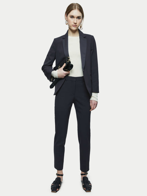 Tailored short blazer cut from a technical crepe blend with contrast satin lapel and jet pockets. Featuring a single button fastening, notch lapel, jet flap pockets and back vent. Fit and Features
