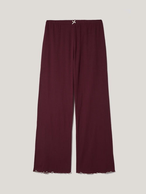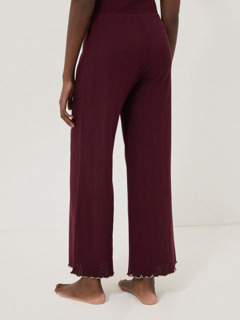 Hit the hay in super-soft comfort with these cropped pyjama trousers. Designed in a bespoke pointelle pattern with contrast baby overlocking detail, they come in two key colours; navy and burgundy with a matching top available for the full pyjama set.