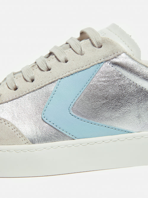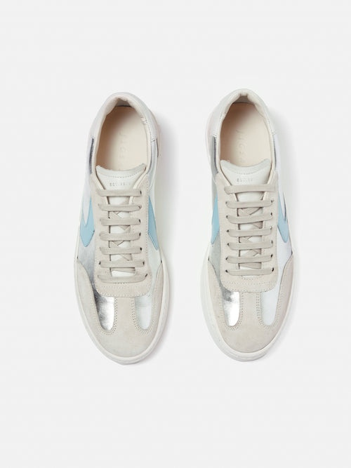 Informed by a retro tennis vibe our best selling Portland Vintage Classic Trainer features a simple but beautifully proportioned cup sole, combined with a fashion upper for a slim profile and finished with wax cotton laces. Arriving for the new season in modern silver leather mixed with grey suede and a flash of light blue. Fit and Features