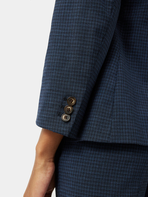 Tailored blazer cut from an Italian wool-blend fabric in blue gingham check. Featuring a single-breasted front and front welt pockets with flaps. Fully lined, elevated by bias piping added to lining seam and Melton under collar. A short casual blazer, perfect for light layering. Complete the set with our Portofino Palmer Check Trouser or pare back with some denim jeans. Fit and Features