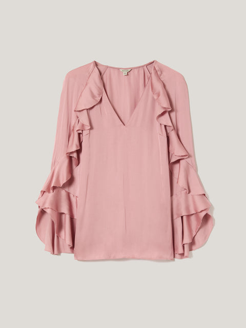 Evoking 70s-inspired romance, this top is dressed up with frills galore. Framing the neckline and sleeves, this beautiful detail brings movement, drapery and body to your evening look, while the recycled satin fabrication adds a lustrous finish.