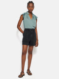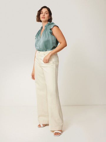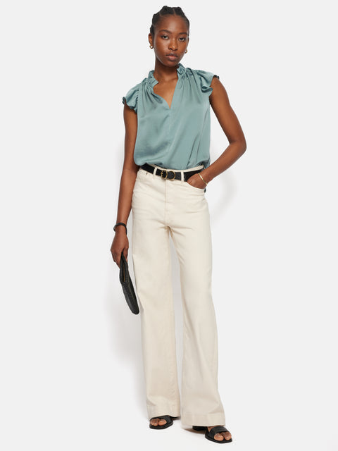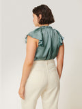 Intricate, feminine construction meets a nature-inspired hue with our Recycled Satin Frill Neck Top. Featuring gathering at the back and centre-front and frills on the neck and shoulder, this is an elegant wardrobe staple in the making – equally as suited to dressing up with tailored trousers or a skirt as it is down with jeans or high-waisted shorts.