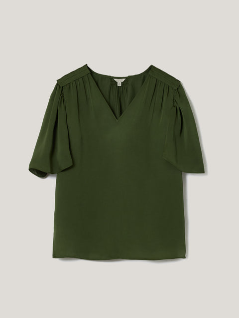 Sustainable in a luxe recycled satin, this blouse is framed with an intricate pleated trim around the collar and short sleeves that hang beautifully off the shoulder; perfect for wear day or night.