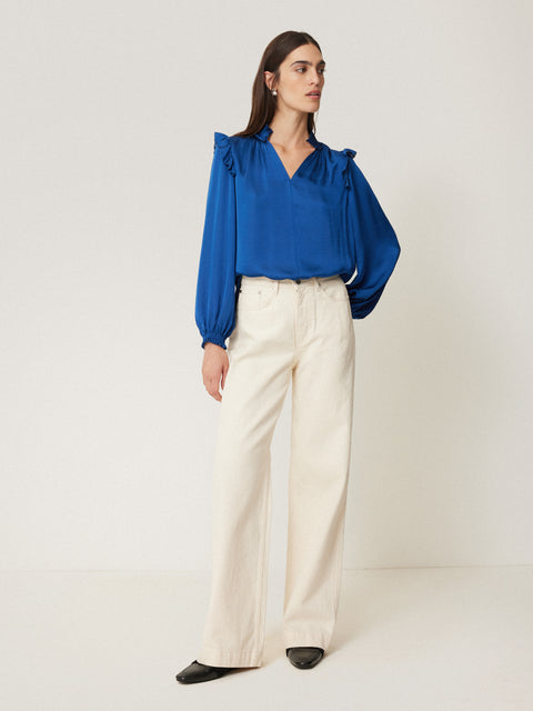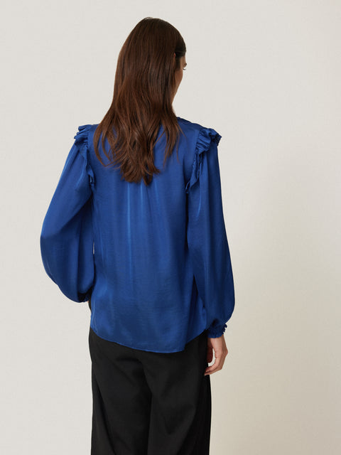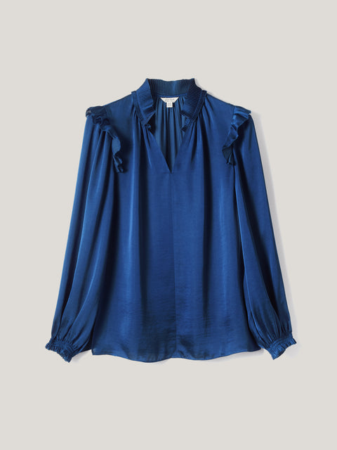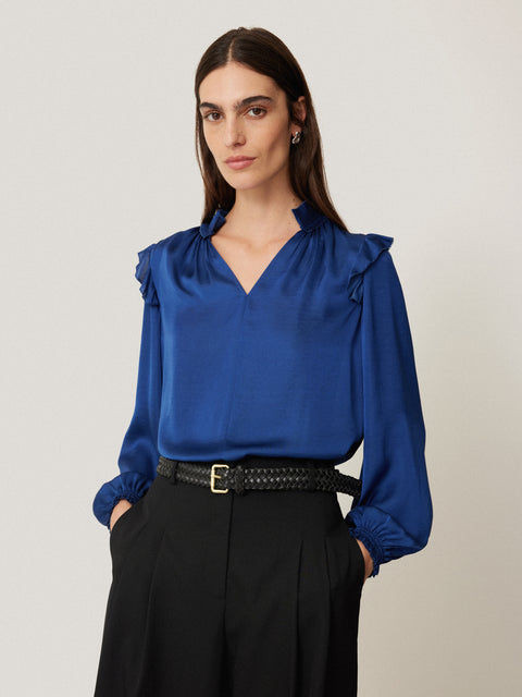 Framed by soft, romantic ruffles and a frill collar, this season sees more feminine elements across the collection. Fluid in recycled satin, this top features long sleeves with elasticated cuffs to roll up or down to your desired length.