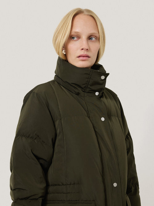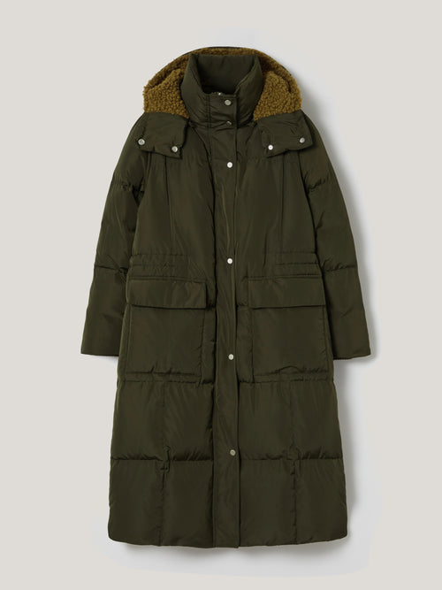 The puffer coat remains a faithful favourite for the winter months. This iteration boasts plush padded down panels with an elasticated waist and a cosy faux shearling lined hood for all day comfort and warmth. Popper sides allow for ventilation and extra room for movement, with two oversized pockets and silver-tone popper fastenings for a chic, utilitarian feel.
