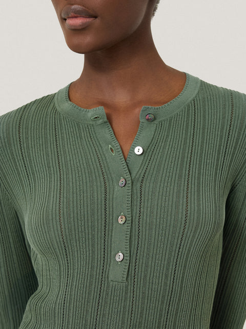This classic Henley top is a layering piece you will reach for again and again. Updated in a pointelle knit jersey for softness with elegant Mother of Pearl button fastenings, we love its endless versatility both under a knit or worn alone with denim.