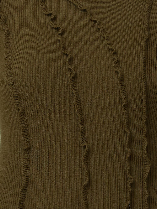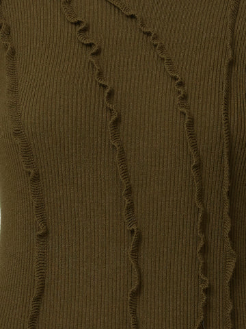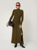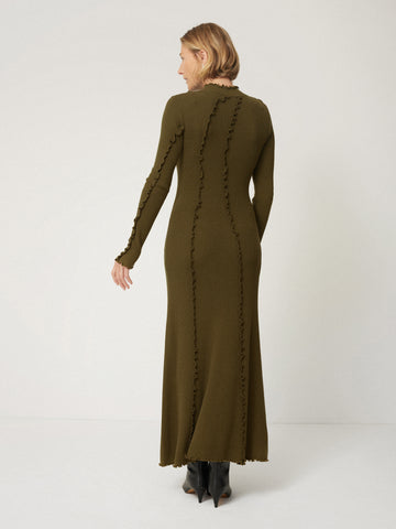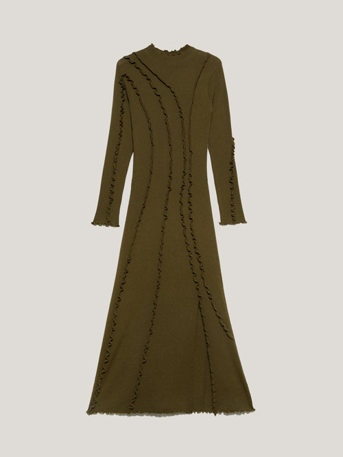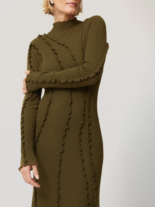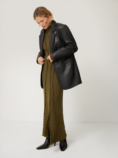Day-to-night versatility, wrinkle resistant: the knitted dress deserves a place in every wardrobe. Enhanced with ruffle details and a form-fitting silhouette, it infuses a feminine touch into its traditionally masculine colour. This perfect balance of tensions imbues the dress with a 'do-it-all' demeanour, suitable for work, drinks, and dinner engagements.