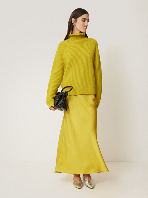 A primary bright instantly energises your wardrobe. This maxi skirt is ready to bring zing to grey skies in a cheerful yellow hue satin with a bias cut for beautiful drapery and comfort as you wear throughout the day. Team with a chunky knit and metallic heels.