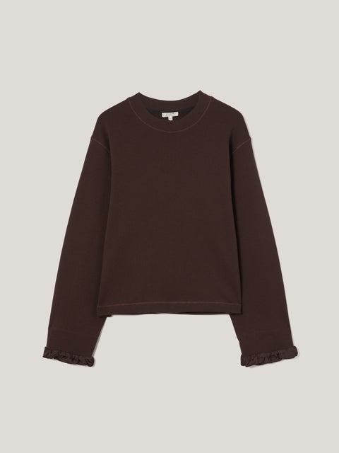 The casual jersey sweatshirt receives a subtle feminine rework for the new season in the form of frilled satin cuffs. This elegant detail instantly elevates the jumper's clean lines. Made to be mixed and matched with the co-ordinating joggers for downtime.
