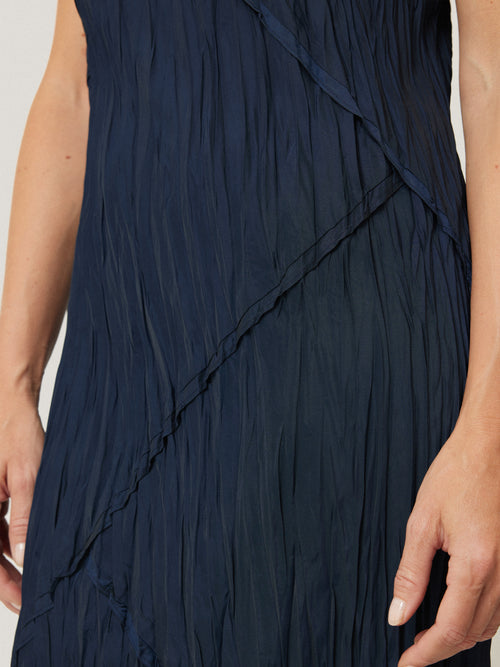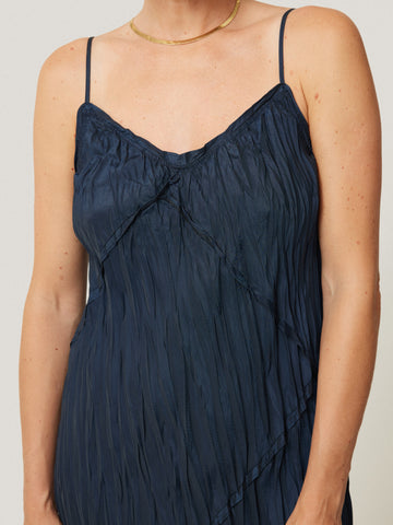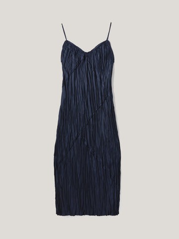 The 90s-style slip dress is reimagined with this lustrous blue design, using a crinkle plisse fabric and pleated seam detail for a tactile spin. The bias cut makes it ideal for wearing alone or underneath a blouse or knit when the weather cools.