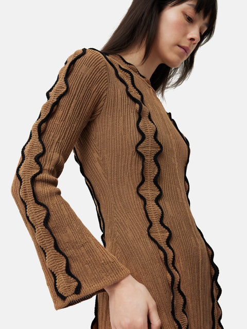 This captivating dress embodies the balance of contrasts, a substantial cotton blend knit elegantly draping alongside delicate feminine scallop details, perfect for navigating the demands of modern life. Crafted to create a super flattering silhouette, the added scallop trims provide 3D texture and cleverly conceal imperfections, blending sophistication with practicality.