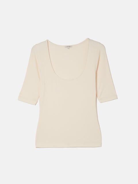 This ribbed, slim-fit top features a scoop neckline that delicately accentuates the collarbone, creating an ideal canvas to showcase your favourite jewellery pieces.