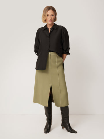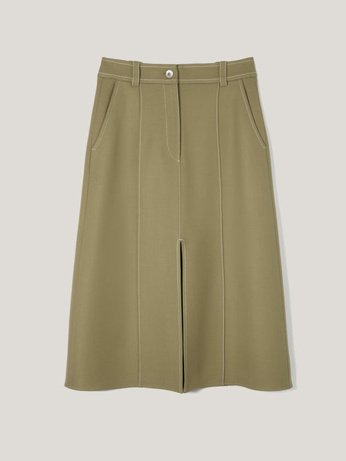 It's often the smallest details that make the most significant impact. The top-stitching intricacies elevate this durable Italian wool twill, lending remarkable definition to craft this utility-chic midi skirt. Complete with a centre front split for effortless movement, it's a testament to both style and practicality.
