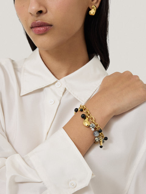 A new genre of boho welcomes beaded embellishments scattered across spring's key jewellery. Included is this statement bracelet in 24ct gold plated brass, festooned with a mix of decorative semi precious beads and molten organic charms that suspend from a classic chain.