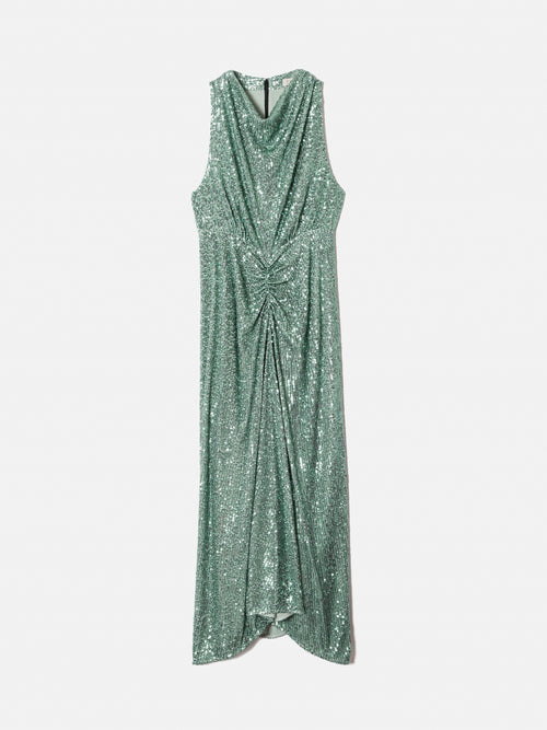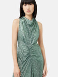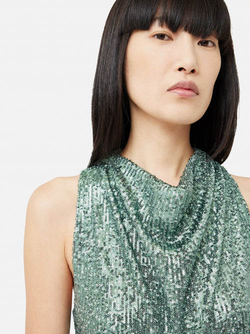 An update on our iconic sequin midi dress; switching out the V neckline for a more feminine cowl neck. Designed with ruched detail on the front and back seams to create a beautiful draped silhouette and flattering fit. Fully lined with a knitted stretch base for extra comfort. Style with heels or boots to curate the ultimate show-stopper. Fit and Features