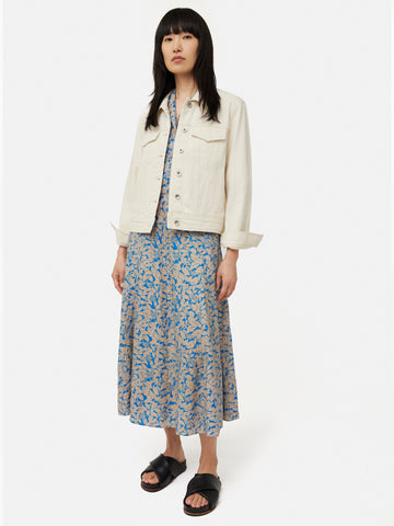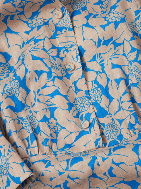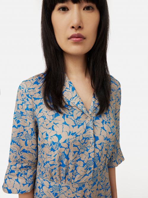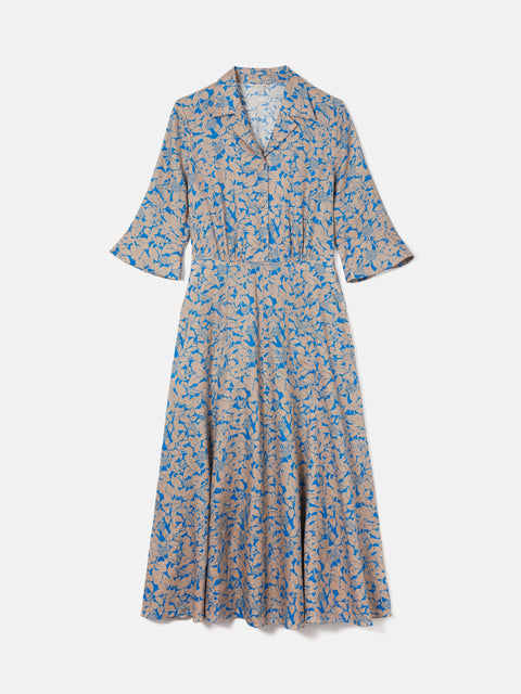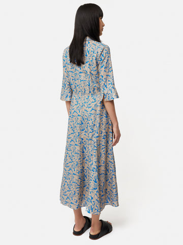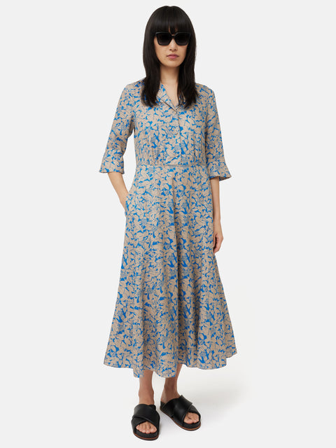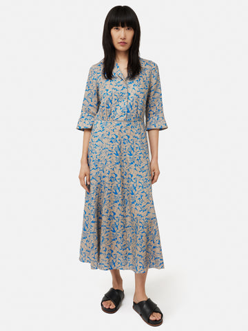 Our best-selling shirt dress reimagined in a Shadow Leaf printed pure linen. Easy fitting throughout the body with gathered waist seam detail, 3/4 length sleeves, half button placket and flared skirt. Features functional front pockets and invisible side zip. A great print dress that grounds an earthy neutral with a pop of blue. Fit and Features