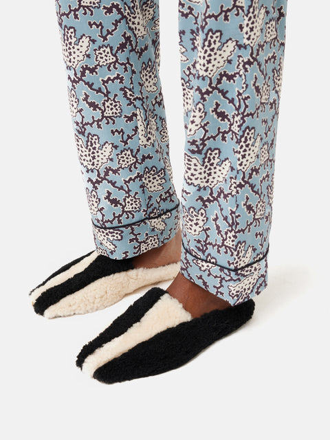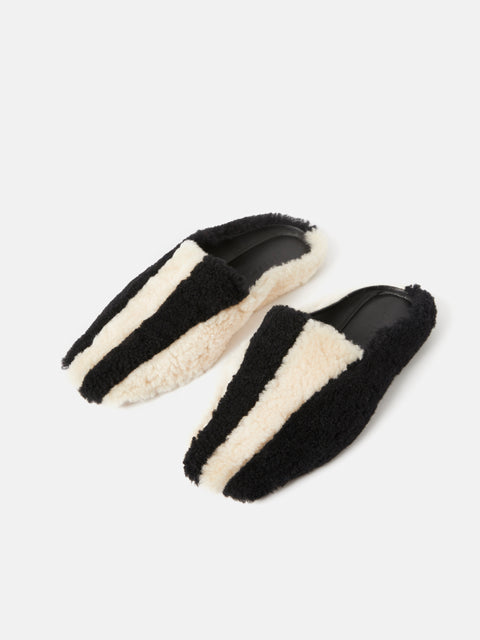 Keep your feet cosy through cold winter days with our luxe slippers featuring all over soft shearling with a black and white striped pattern. Slip on for ease and comfort and wear all day long. Fit and Features