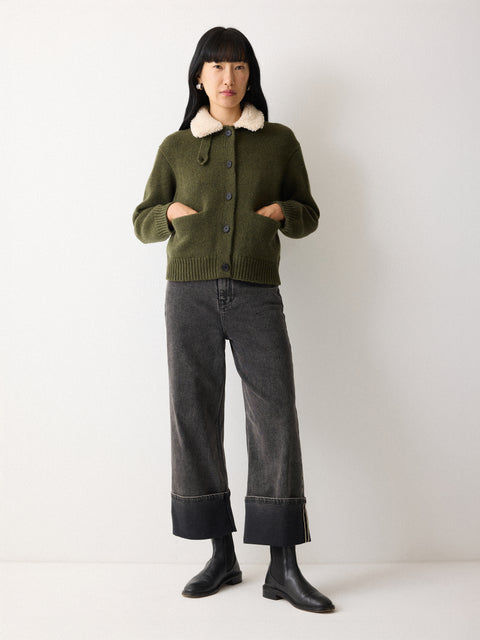 A moss green Cardigan elevated with a Sherpa collar for colder days. With front buttons, welt pockets and neck fastening to create a funnel neck silhouette. Gigi is 5'10 and wears a size 8