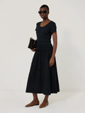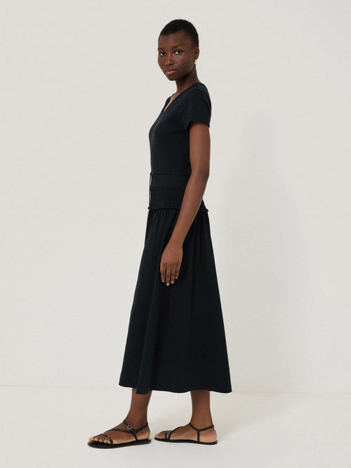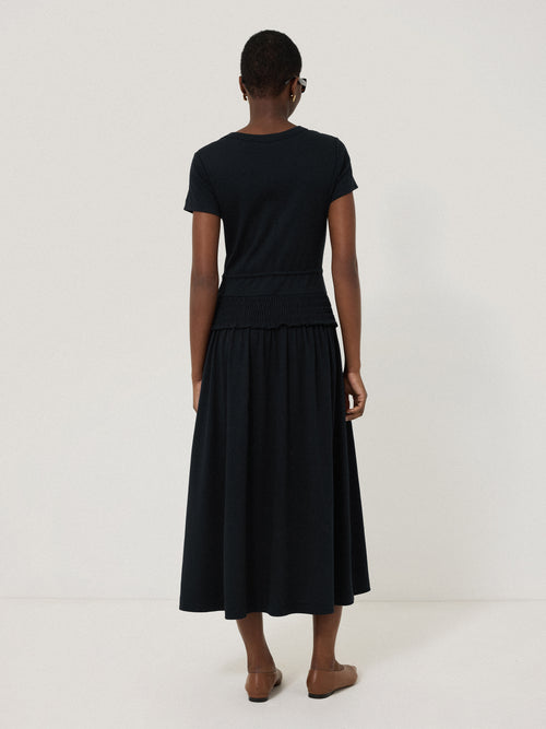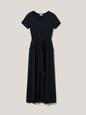 We love the ease of this navy T-shirt dress for the warmer months. Super soft and comfortable in a subtle textured jersey, it's decorated with tassel tie drawstrings and a shirred drop waist; both details that will keep your look summer appropriate.