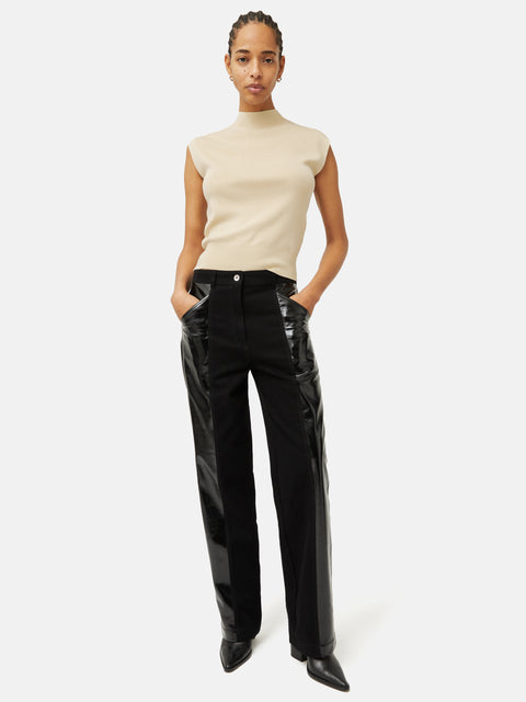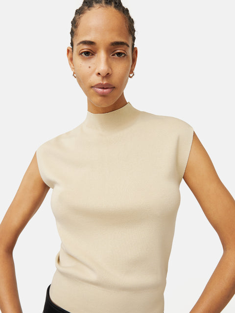 Redefining the essentials, our silk-cotton blend top features a sleek funnel neck and playful cap sleeves, offering a luxurious twist to your wardrobe staples. Effortlessly versatile, it serves as the perfect foundational piece beneath your tailored attire. Fit and Features