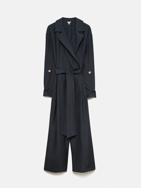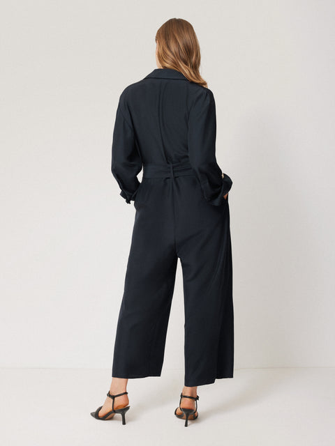 Developed in our in-house atelier, this navy jumpsuit evokes the senses in pure silk for beautiful movement and fluidity with a relaxed fit to match. A mock wrap front and self-tie belt cinches in the silhouette, while molten gold buttons have been created exclusively for Jigsaw to lend an organic feel.