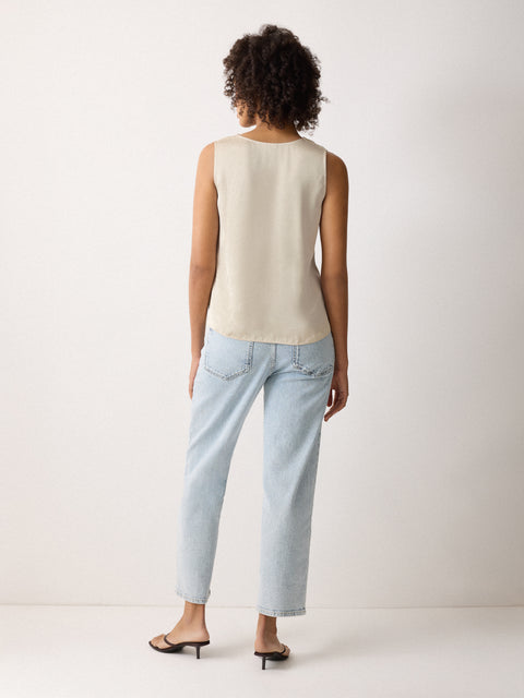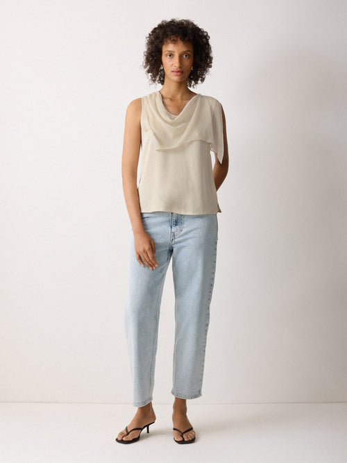 This top embodies Grecian inspiration, using a fluid viscose fabrication mixed with a drapey silk trim ruffle, bringing texture and interest to this otherwise understated design.