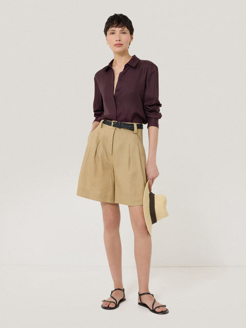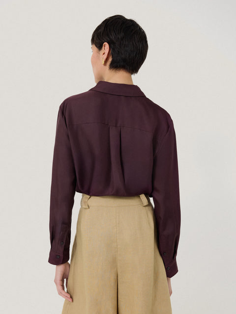 A beautiful silk twill brings lustre and elegance to this button-down shirt, perfect for a laidback evening look. Designed in a rich and deep shade of oxblood, it works beautifully with a fluid, wide leg trouser.