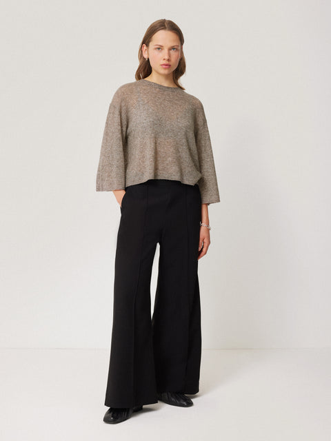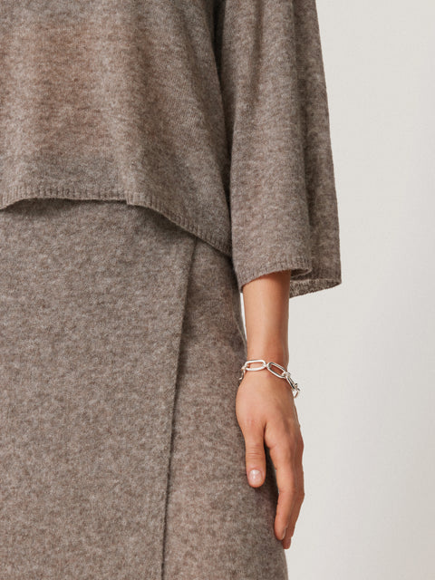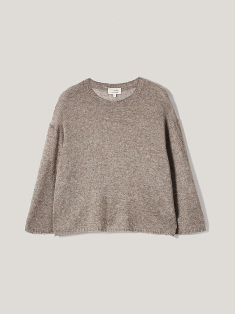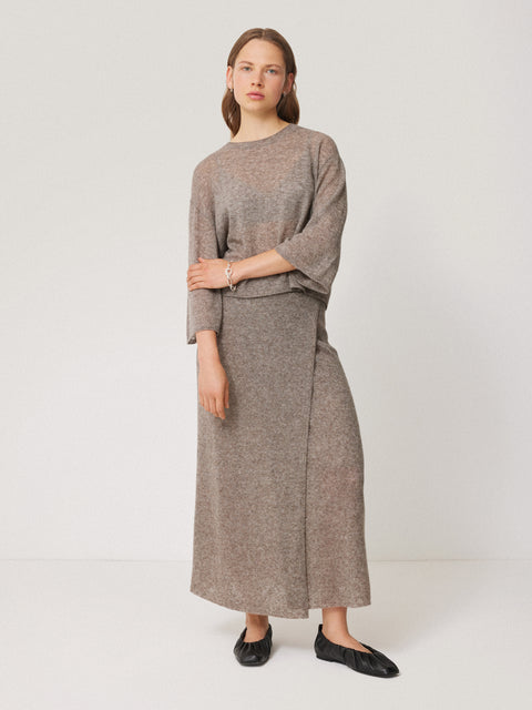 This long sleeved T-shirt elevates downtime at home and beyond in a sheer gauze knit, which has been infused with ultra-soft alpaca yarns. Cut for a loose relaxed fit with wide sleeves, this knit forms part of a skirt and scarf in the same fabrication for a cosy head-to-toe look.