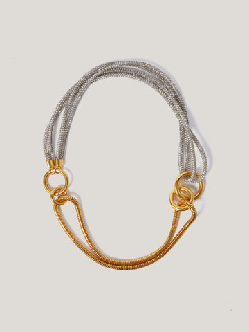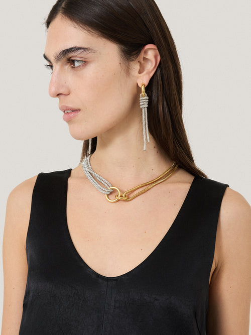 When it comes to the festive season, you can always rely on beautiful jewellery to dazzle from near and afar. Festooned with sparkling pave embellishment in a mixed metal cord design, we love this necklace as a stand-alone statement or paired with the matching earrings.