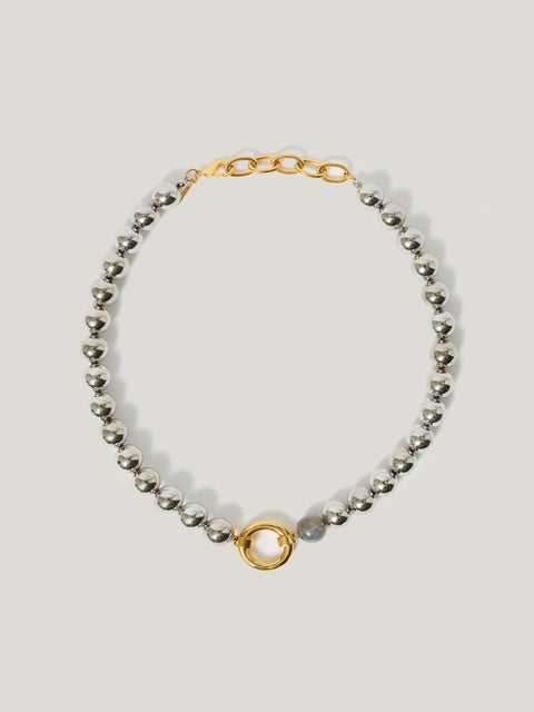 Elevate any neckline with this contemporary beaded necklace for the new season. Mixed metals of 24ct gold and sterling silver plated beads sit alongside a singular labradorite bead for an ethereal twist.