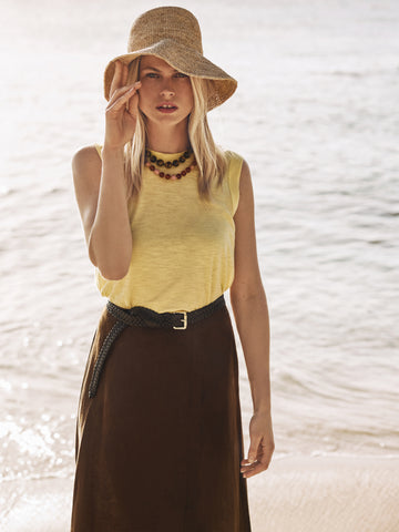 Raffia accessories never go out of style. This straw bucket is a timeless accessory for the warmer months to keep your head cool and your outfit even cooler.