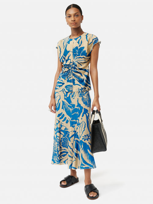 Our modern Strokes Floral pattern appears on a rich, textured jacquard top. The texture of the fabric is enhanced by front and back gathering and a ruffle trim cap sleeve. The centre front lapped seam has delicate picot edge details. Features an invisible back zip. Style with matching Strokes Floral Jacquard Skirt for a stand-out occasionwear co-ordinate set. Fit and Features
