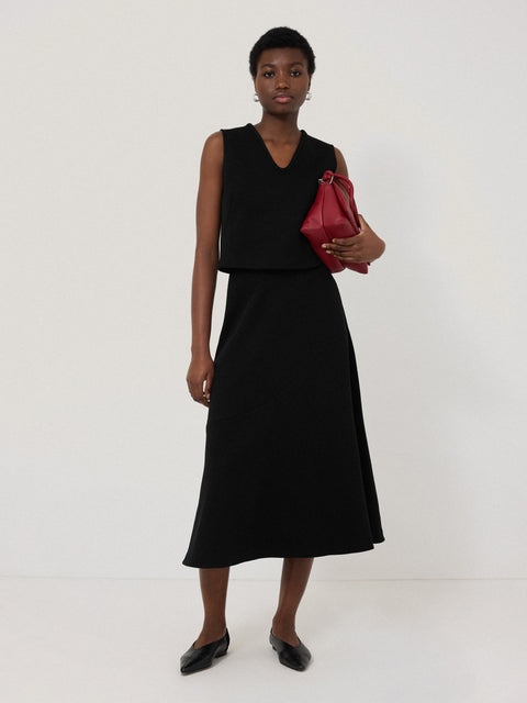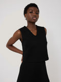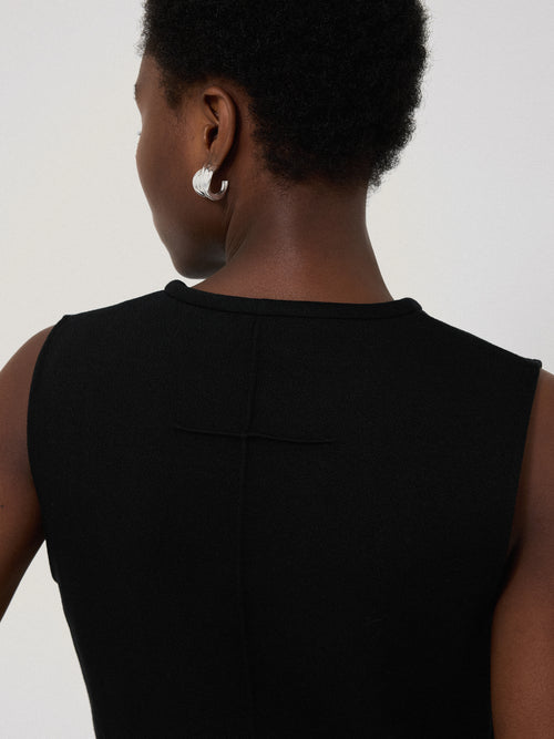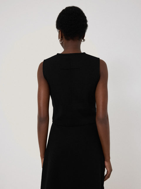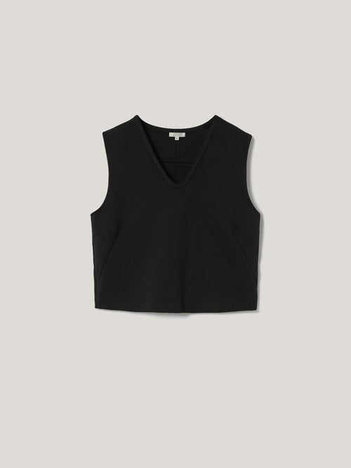Designed as part of a co-ord, this black top has been crafted from a mid-weight crepe ponte jersey, lending structure to the cropped boxy fit. Detailed with a scoop V-neck and pintuck detail to the back, wear with the matching skirt for easy elegance during the summertime or mix and match with other pieces in your wardrobe.
