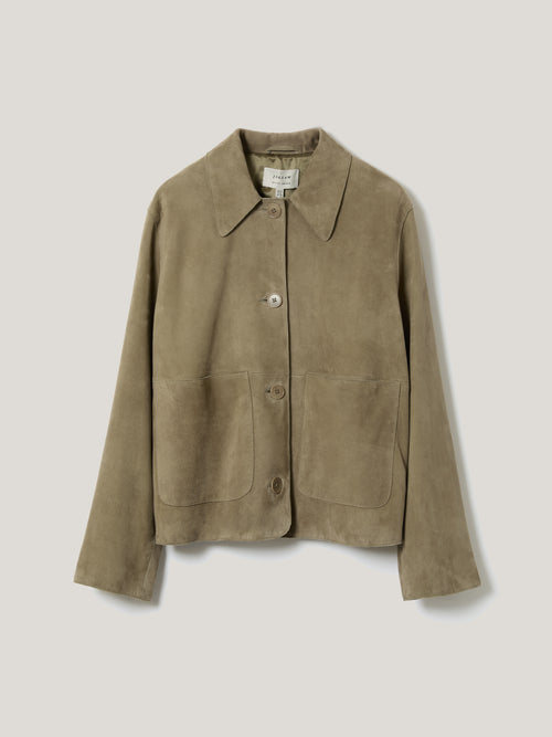 The boxy cropped fit of this jacket is exemplary of utilitarian style with a twist. Reimagined in super-soft suede, a smooth point collar and twin patch pockets complete the look.