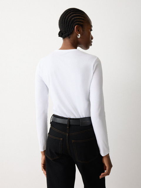 Soft Supima cotton long sleeve T-shirt. Cut in a classic fit silhouette with long slim sleeves this elevated basic serves as a great foundation piece for any outfit. Supima Cotton is a superior in quality cotton with exceptional strength, softness, colour retention and a luxurious lustre.