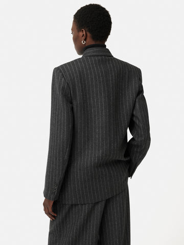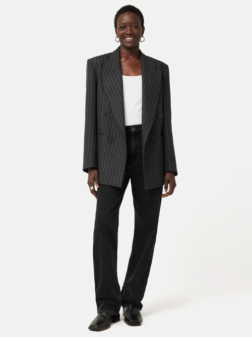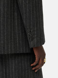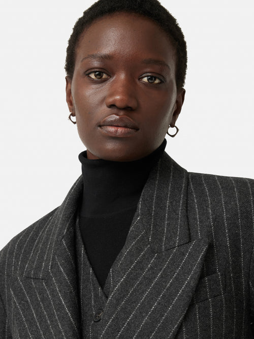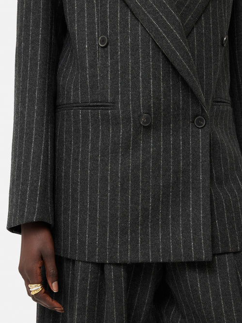Introducing the Tatton, our new season tailoring shape. Patterned in-house for the perfect fit, this double-breasted blazer has a directional silhouette and structure through the shoulder. Crafted in a charcoal pinstripe wool-blend fabric from Italian heritage mill, Mantecco. Fully lined, featuring a melton undercollar, internal piping, front flap pockets and a single back vent. Arrives oversized so size down for a more fitted silhouette. Matching trousers and waistcoat complete this three-piece powerhouse suit or pare it back over jeans and a cotton shirt. Fit and Features