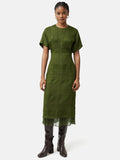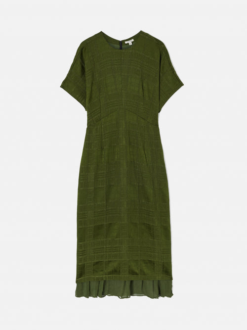 The perfect work-to-dinner dress solution. Woven in a checked, textured jacquard fabric, fully lined and elevated with a viscose georgette hem detail. Slim fitting at the waist with a higher curved waist seam and easy raglan sleeves. Style it under our new season trench and paired with a leather mule. Fit and Features
