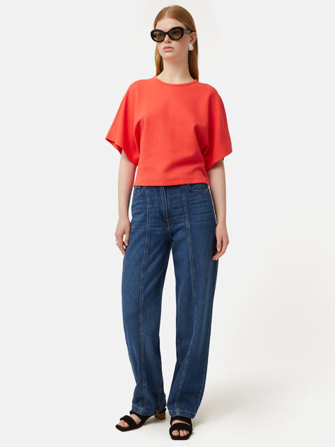 Designed to effortlessly graze the waistband of high-waisted trousers for an impeccable silhouette. With gracefully draped sleeves and an elevated essence, this piece redefines the boundaries of the classic basic.