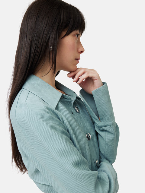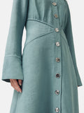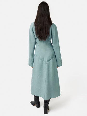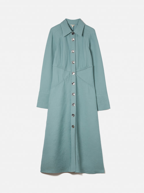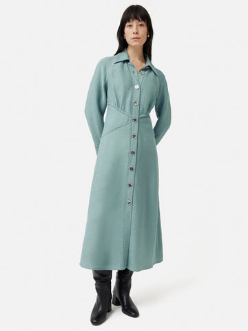 New shirt dress silhouette in a ribbed, textured crepe fabric. Button through front, bias cut skirt and detailed with stylish triangle panels at the waist and external French seam details. Slightly fluted cuffs with slits. Perfect for day to night dressing, this dress can easily be styled up with knee-length boots and statement belt. Fit and Features