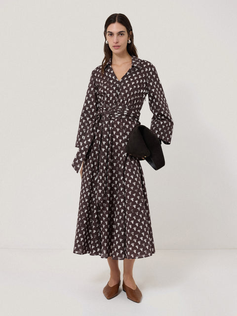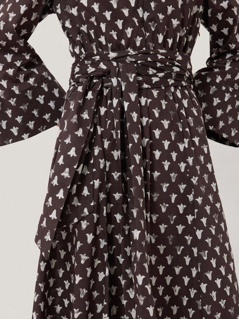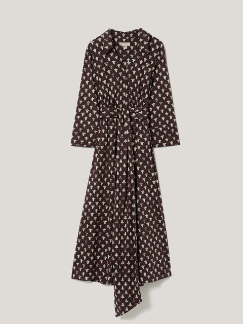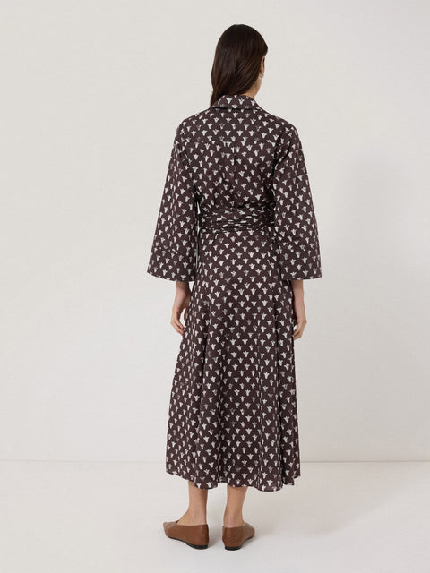 Bring this elegant shirt dress out whenever the warmer weather calls. Lightweight and breezy in cotton voile, it showcases a tulip block print pattern, lending this dress a decorative, artisanal statement for day or night.