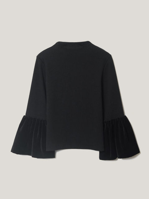 Our knitted top in black has some added drama with peplum sleeves in a textured velvet. Style simply with black trousers and boots for a look you can wear from day to night.